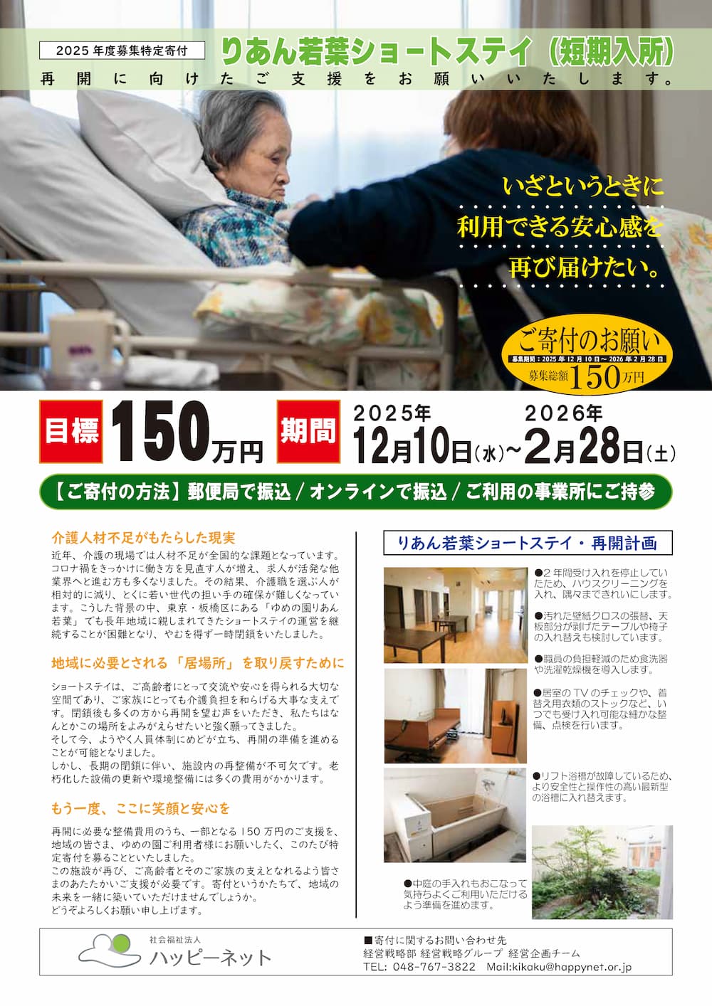 発達上の課題があり、支援が必要なお子さんたちが放課後や休日に通う、児童発達支援及び放課後等デイサー ビスである、ハッピーネットのみらいずグループは、埼玉県、東京都で地域の中で先駆け的事業所が多く、開設10 年を超える事業所が増えてきました。歴史と共に、大~中規模の修繕が必要となり2025 年度は「みらいず笠幡」「みらいず本郷」「みらいず蓮根」で工事を計画しています。これから先もずっと地域のお子さんたちを支えられるよう、皆様のあたたかいご支援を、心よりお待ちしております。